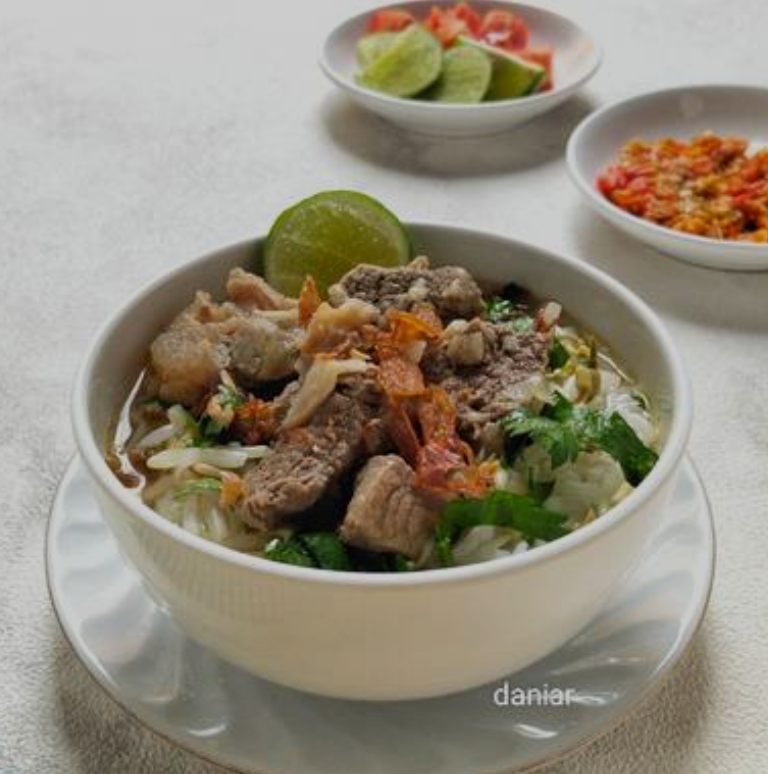 - Soto Daging Kuah Bening siap disajikan di mangkok dengan tambahan bahan pelengkap tauge atau daun kol serta taburan daun bawang, daun seledri, dan bawang goreng.