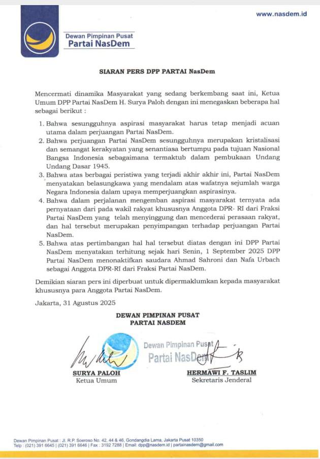 “DPP Partai NasDem menyatakan terhitung sejak hari Senin, 1 September 2025 DPP Partai NasDem menonaktifkan saudara Ahmad Sahroni dan Nafa Urbach sebagai Anggota DPR-RI dari Fraksi Partai NasDem,” ujar Sekjen DPP Partai NasDem Hermawi Taslim saat membacakan surat keputusan DPP Partai NasDem, Jakarta, Minggu, 31 Agustus 2025.