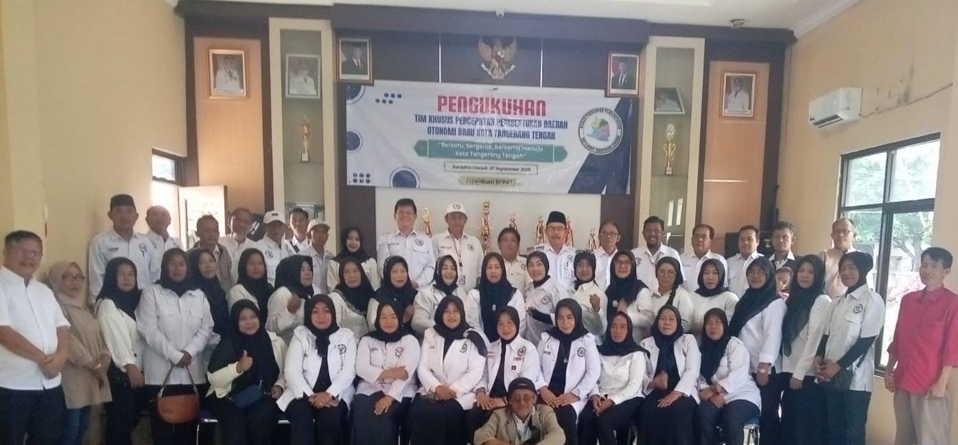 Tangerang, Dinamikanews.net – Presidium Badan Pengurus Pusat Kota Tangerang Tengah (BPPKTT) menggelar pengukuhan Tim Khusus Percepatan Pembentukan Daerah Otonomi Baru (DOB) Kota Tangerang Tengah. Acara yang berlangsung di Aula Kantor Desa Suradita, Cisauk, Kabupaten Tangerang, Banten, pada Minggu (7/9/25) ini dibuka langsung oleh Ketua Umum BPPKTT, Nurdin H.M Satibi, didampingi Sekretaris Umum Tetep Bingbing Gunadi, S.Pd, Bendahara Umum Stefanus S. Kom, serta Tim Pengarah sekaligus Dewan Pakar BPPKTT, H. Yoyon.