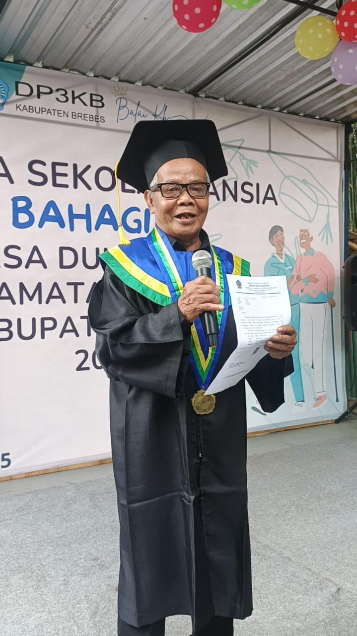 Brebes, Dinamikanews.net – Semangat belajar tak pernah pudar oleh usia. Buktinya, sebanyak 79 lansia justru merayakan puncak perjalanan ilmu mereka dengan mengikuti prosesi wisuda Sekolah Lansia Bahagia di Desa Dukuhturi, Kecamatan Bumiayu, Kabupaten Brebes, Selasa (21/10/2025). Dari puluhan peserta yang penuh semangat, sorotan utama jatuh kepada Mbah Kaidi (84), yang dinobatkan bukan hanya sebagai wisudawan tertua, tetapi juga sebagai lulusan terbaik.
