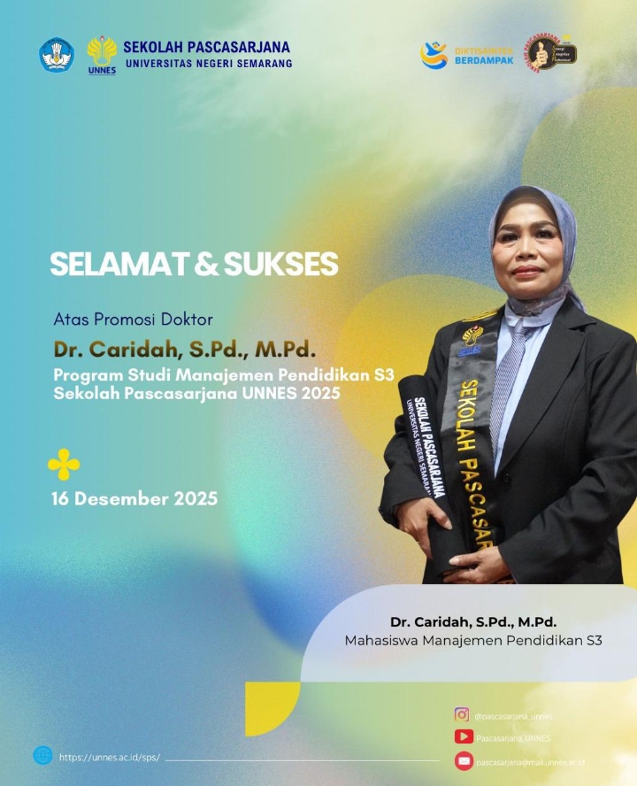 Semarang, Dinamikanews.net – Senin 16 Desember 2025 – Sekolah Pascasarjana Universitas Negeri Semarang (Unnes) kembali melahirkan Doktor baru dalam bidang Manajemen Pendidikan. Dr. Caridah, S.Pd, M.Pd, telah berhasil menyelesaikan studinya di Program Studi S3 Manajemen Pendidikan dan secara resmi menyandang gelar Doktor.